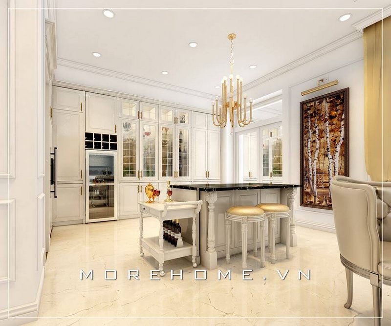 Mẫu bàn đảo bếp gỗ màu trắng cao cấp, mặt bàn ốp đá giúp không gian phòng bếp sạch sẽ và tiện nghi